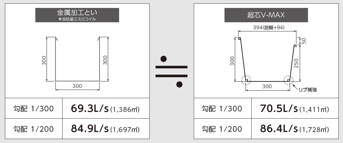 塩ビのきといで業界一*の大容量により、金属加工といと同等の排水能力を実現します。