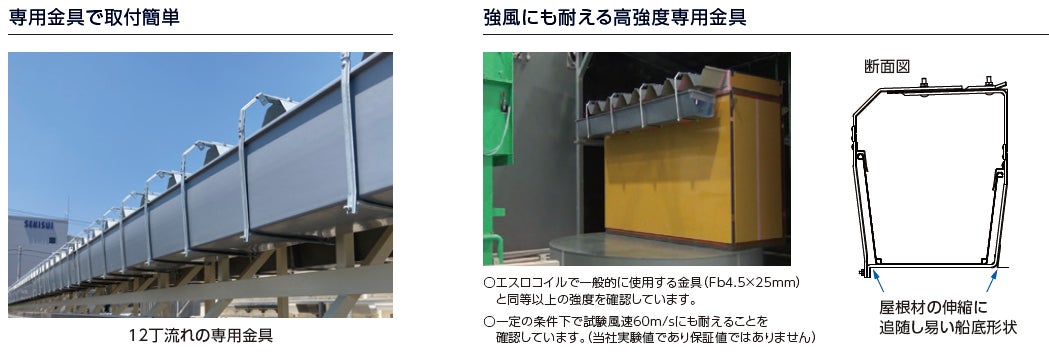 当社では、業界で初めて大容量の大型塩ビ雨といの既製品を発売することで業界の標準化を目指すとともに、集中豪雨発生時の排水能力拡大による建物の維持、ならびに省施工による工数削減で、職人不足という社会課題の解決にも貢献します。
