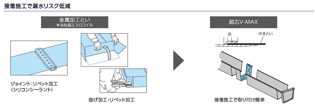 また、大型建物用ののきといは既製品がなく、金属のコイルを職人が各現場の仕様に合わせて加工するのが一般的ですが、止水処理の品質の均一化や施工の省力化が課題となっています。
