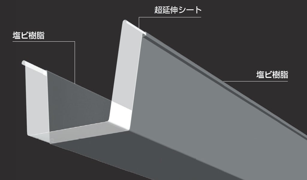 「超芯V-MAX」は、現在好評をいただいている超芯V・Pシリーズと同様の超延伸シートと塩ビ樹脂の3層構造で構成される業界最大級の大容量雨といです。大型の物流倉庫等で使用される金属加工といと同等の排水能力を実現するとともに、専用金具を品揃えすることにより、現場作業の軽減、施工品質の向上を実現します。