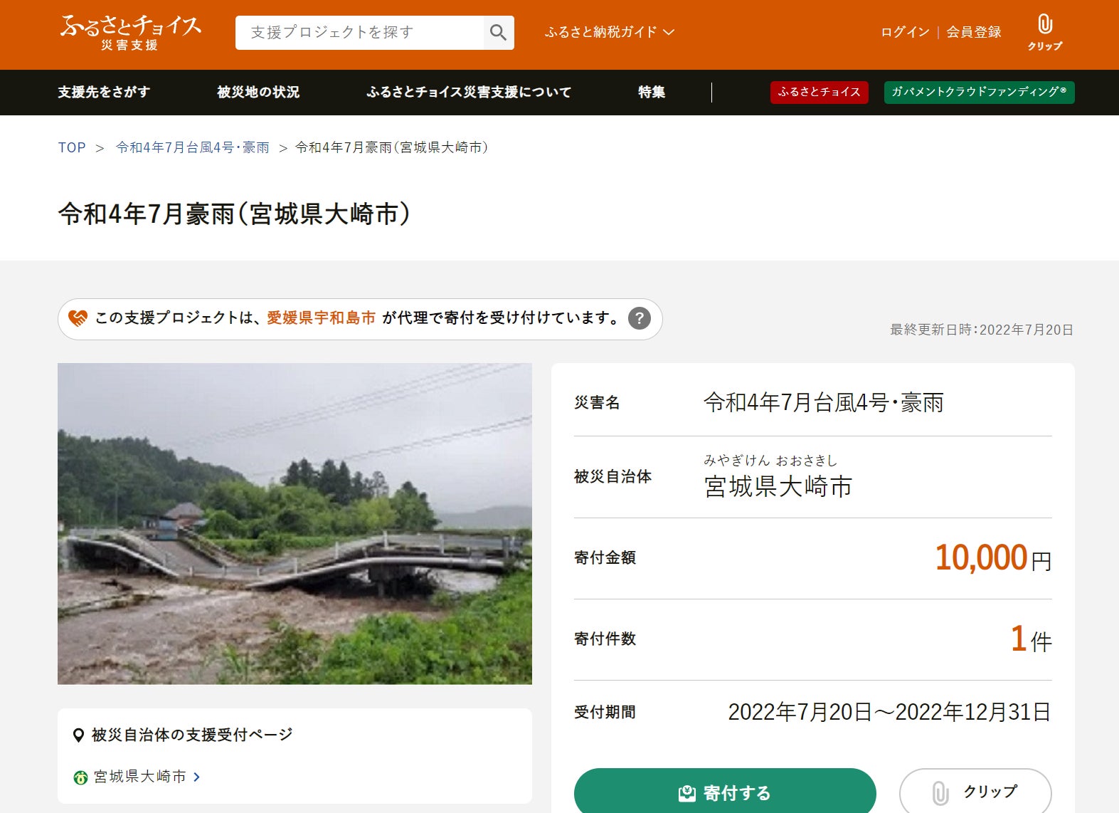 国内最大級のふるさと納税総合サイト「ふるさとチョイス」を企画・運営する株式会社トラストバンク(本社:東京都渋谷区、代表取締役:川村憲一、以下「トラストバンク」)は7月20日、ふるさと納税で被災自治体の災害支援に寄付できる仕組み「ふるさとチョイス災害支援」( https://www.furusato-tax.jp/saigai/ )で、記録的な大雨により被災した宮城県大崎市の支援のため、代理寄付受付を開始します。代理寄付の受付では、大崎市と姉妹都市である愛媛県宇和島市が大崎市の代わりに寄付を受け付けます。