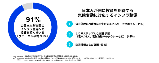 気候変動に対応する日本のインフラ投資は「公共施設の冷暖房への再生可能エネルギーの活用」「サステナブルな交通手段」が支持されている