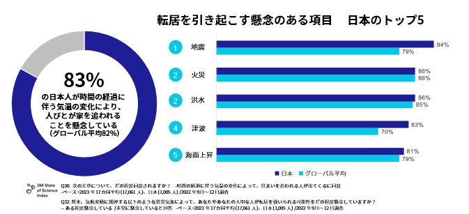 日本では「時間の経過に伴う気温の変化により人びとが住まいを追われることを懸念する」との項目に83%(グローバル平均82%)の人が同意しています。また、気候変動に関連する影響のうち「地震(94%)」、「火災(86%)」、「洪水(86%)」、「津波(83%)」「海面上昇(81%)」の順に転居を強いられる可能性が高いと考えており、日本においては特に自然災害の経験を踏まえた「地震」に対する強い懸念が窺えます。一方、グローバル全体では「干ばつ(86%)」、「火災(86%)」、「洪水(85%)」、「熱波(84%)」といった結果になっています。