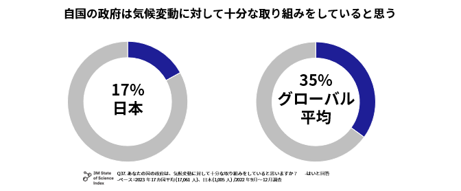 日本では、自国の政府の気候変動に対しての取り組みについて「十分である」と考えている人の割合は17%(グローバル平均35%)、「十分でない」と考えている割合は83%(グローバル平均65%)となっています。グローバル比でみても十分でないと考えている割合が多く、今後の政府によるさらなる取り組みへの高い期待が示されています。