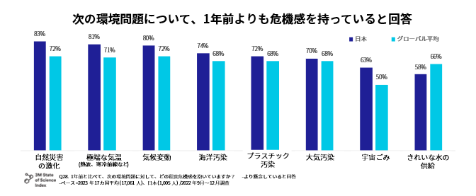 環境問題のうち「1年前よりも危機感を抱いている」と回答した項目として、日本では「自然災害の激化(83%)」「極端な気温(熱波・寒冷前線など)(81%)」「気候変動(80%)」が上位を占め、いずれもグローバル平均よりも高い数値を示しています。一方で、「きれいな水の供給(58%)」と回答した割合についてはグローバル平均(66%)を下回りました。