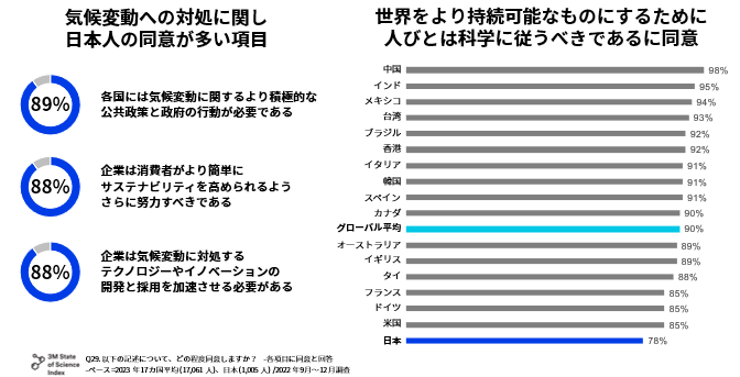 一方で、「世界をより持続可能なものにするために、人びとは科学に従うべきである」に同意した日本人の割合は78%に達するものの、調査国のうち最も低い値となっています。科学の進展を望む一方で、気候変動に対する政府のリーダーシップや各企業によるサステナビリティへの取り組みをさらに深めていくことへのより高い期待感が示されている結果となっています。