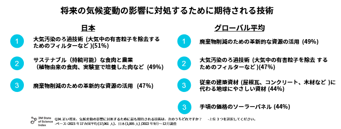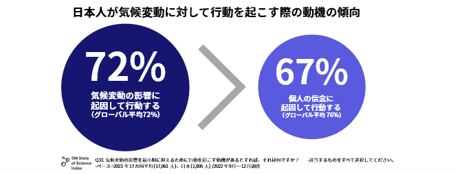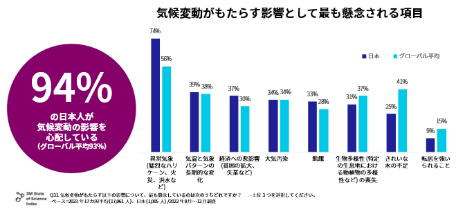 本発表では、3M社(本社:米国ミネソタ州、取締役会長兼最高経営責任者:マイク・ローマン)がグローバルで毎年実施している、人びとの科学に対する意識調査「State of Science Index(ステート・オブ・サイエンス・インデックス)」(以下SOSI)の2023年版調査結果のうち、気候変動に関する項目を取り上げ、これらに関する日本人の意識をグローバルの結果と比較しながらご紹介します。