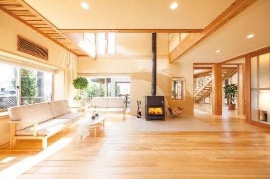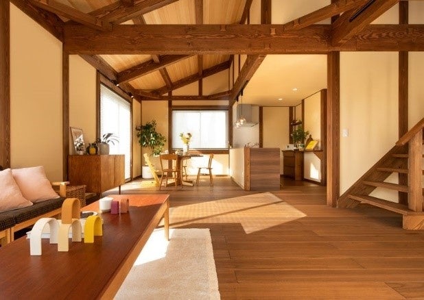 柱や梁等の構造材を露にした日本の伝統工法「真壁づくり」を採用しています。施工のシステム化により、無垢の国産ひのきをふんだんに使用した高品質な住宅を低価格で提供しています。