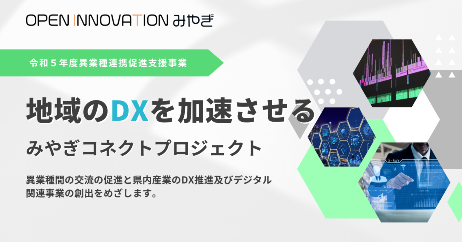 本プロジェクトは、宮城県のICTポータルサイト「Open Innovationみやぎ」を活用した県内企業へのDX推進に関する情報発信を行うとともに、DX推進に長けた企業とDXに取り組んでいこうとする企業を集めたイベント開催により企業間交流を促進し、県内事業者間の連携による地域課題解決につながる新規事業の創出を目指す、宮城県「令和5年度異業種連携促進支援事業業務」において実施します。