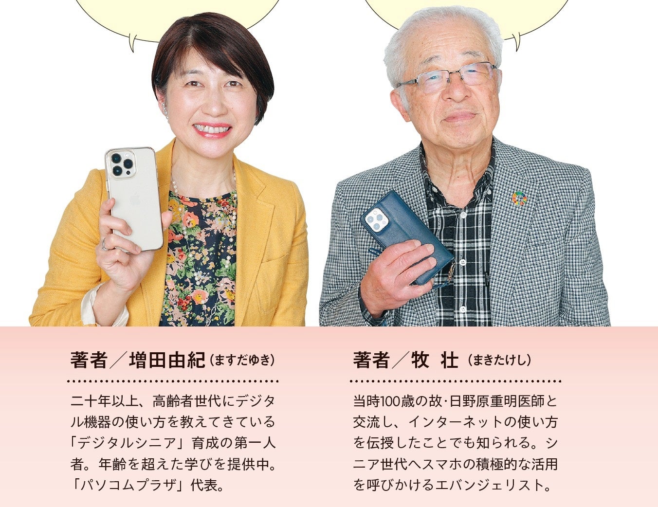 人気スマホ講師&86歳のデジタルシニア第一人者が協力タッグを組みました。女性誌部数No.1「ハルメク」の人気スマホ講師 増田由紀(ますだゆき)さんと、100歳当時の故日野原重明医師にネットを教えた86歳のデジタルシニア第一人者 牧壮(まきたけし)さんが、超高齢社会ニッポンの「スマホ活用術」を徹底解説。