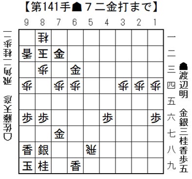 △8二銀    ▲同 馬    △同 玉 ▲6三金    △5八飛    ▲7二金打 まで141手で先手の勝ち