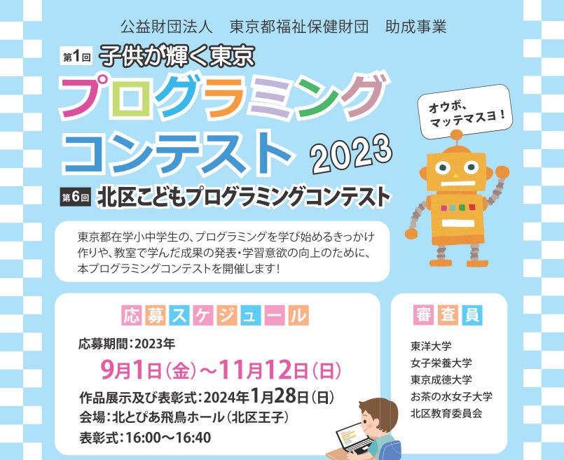 「第1回子供が輝く東京プログラミングコンテスト」は、公益財団法人東京都福祉保健財団の助成事業として 東京都在学・在住小中学生の、プログラミングを学び始めるきっかけ作りや、教室で学んだ成果の発表・学習意欲の向上のために開催されます。