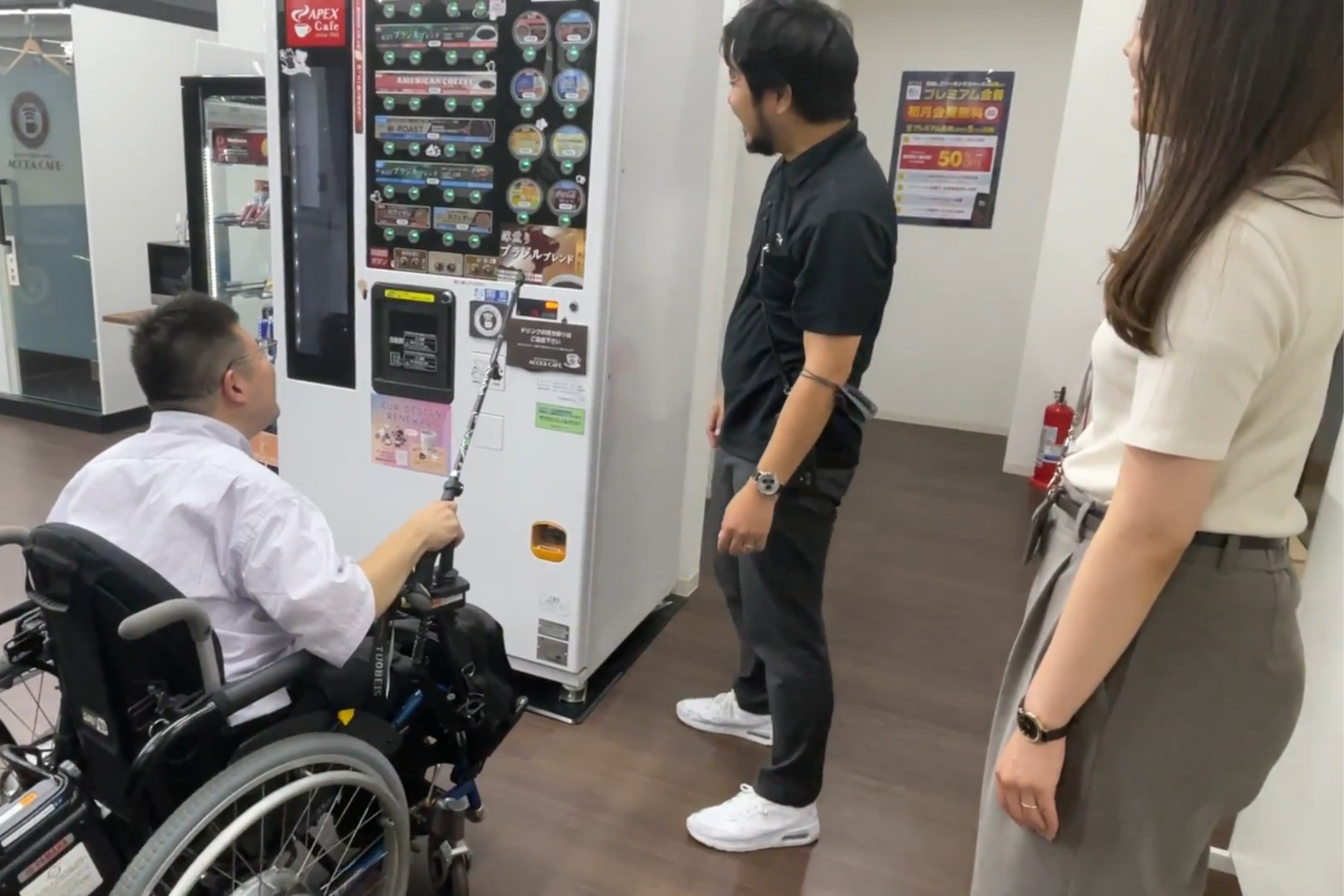 ・手に麻痺がある方や車椅子利用者が自動販売機を使えるように、店舗にある棒を自動販売機の横に設置