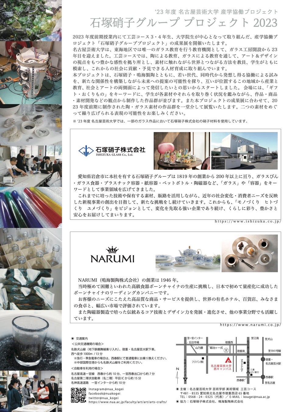 名古屋芸術大学(所在地:愛知県北名古屋市、学長 竹本義明、以下「名古屋芸大」)は、石塚硝子株式会社(本社:愛知県岩倉市、代表取締役 社長執行役員:石塚久継、以下「石塚硝子」)と本年度に実施した産学連携プロジェクトについて成果展を開催いたします。
