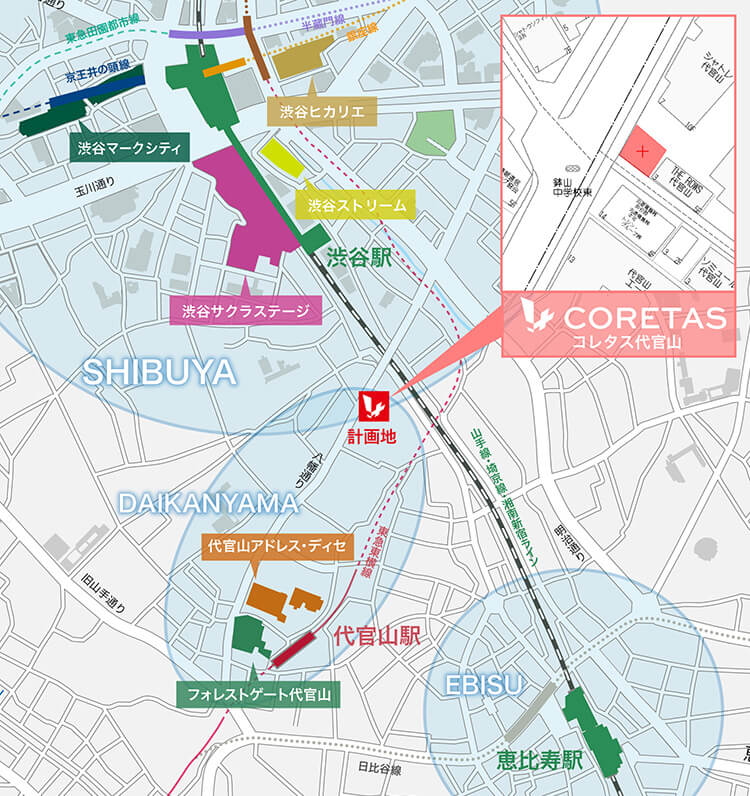 最寄り駅であるビッグターミナル「渋谷」駅と、「代官山」駅からの人の流れが交わる場所。また、「恵比寿」駅からの人の流れも期待できます。