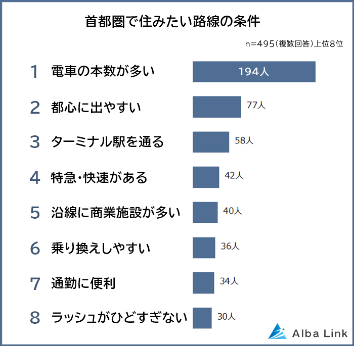 男女495人聞いた「首都圏で住みたい路線の条件」1位は「電車の本数が多い(194人)」。回答者全体の4割を超え、圧倒的多数でした。