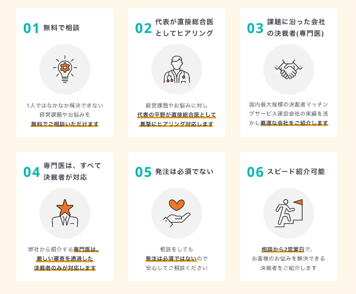 当社の経営経験者が経営課題をヒアリングし、解決できる方法や経験、サービスを持つ決裁者の紹介までをワンストップで行います。