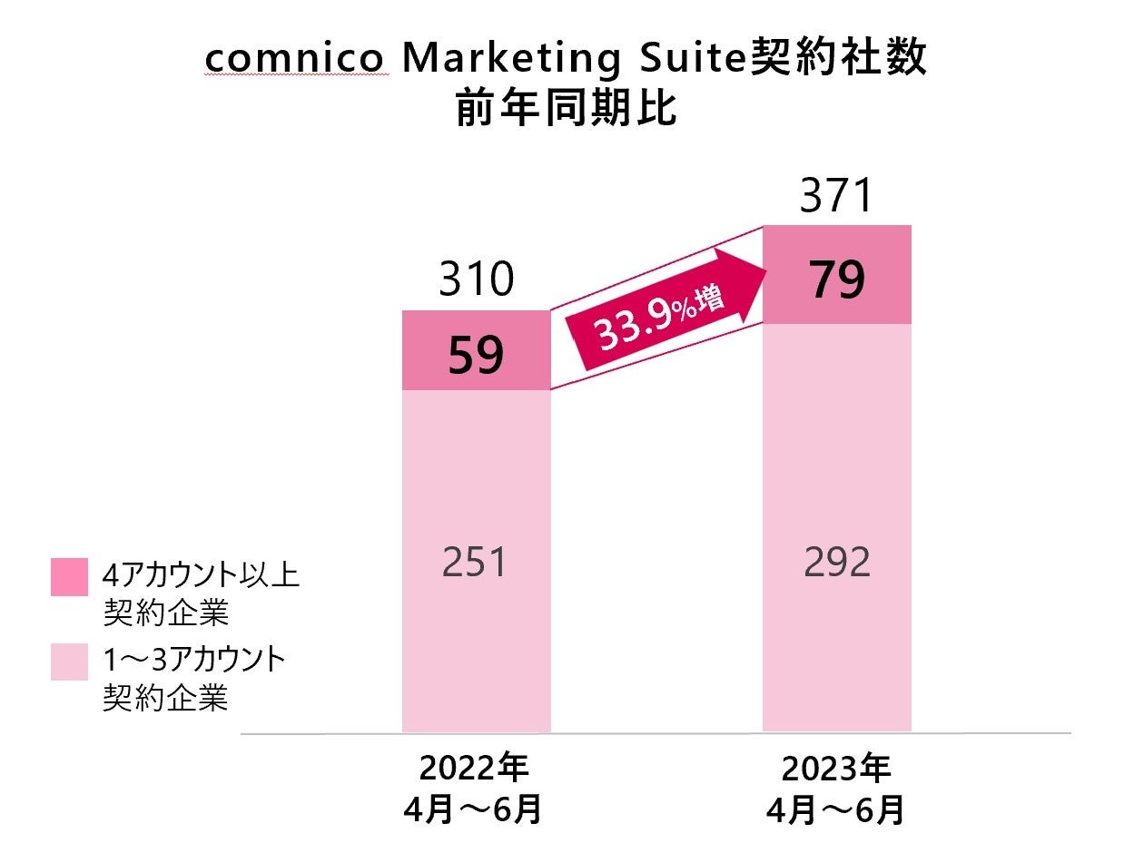 「コムニコ マーケティングスイート」の契約アカウント件数が伸びる要因としては、1社の契約において、4アカウント以上の複数アカウント契約をされるお客様が増えていることが挙げられます。2022年4月~6月と2023年4月~6月の、「コムニコ マーケティングスイート」の契約社のうち、「4アカウント以上(※1)」契約をしている企業の数を比較すると、2022年は59社、2023年は79社と、33.9%増えています。多数のブランドを展開する企業が、ブランド毎でSNSアカウントを開設し運用することがスタンダードになっていることや、複数アカウントを一元管理することでSNS起因のリスクを防止することに繋がるという観点から、複数アカウントを一括管理できるツールへの需要が高まっているものと考えております。