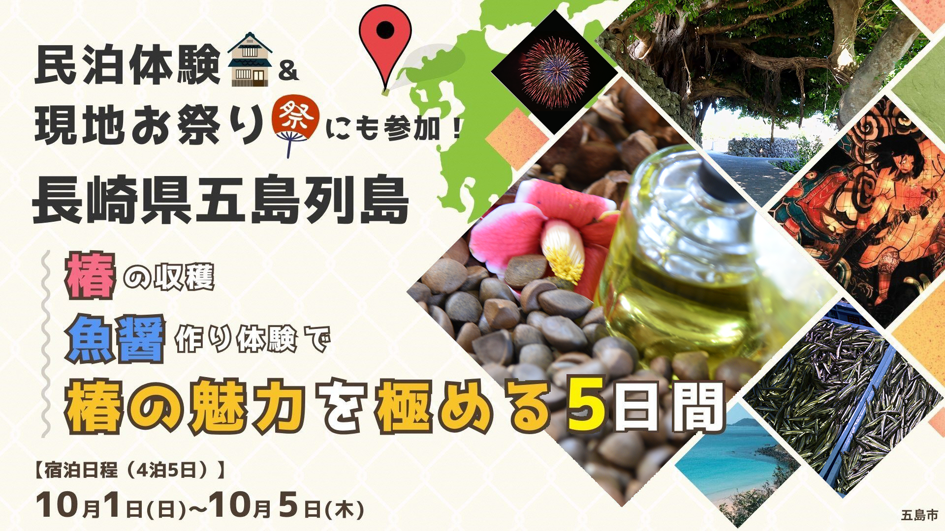 また、期間中に五島市内で開催される「福江みなとまつり」に参加したり、五島市内の民家に「民泊」するなど、地域の人との交流も行います。