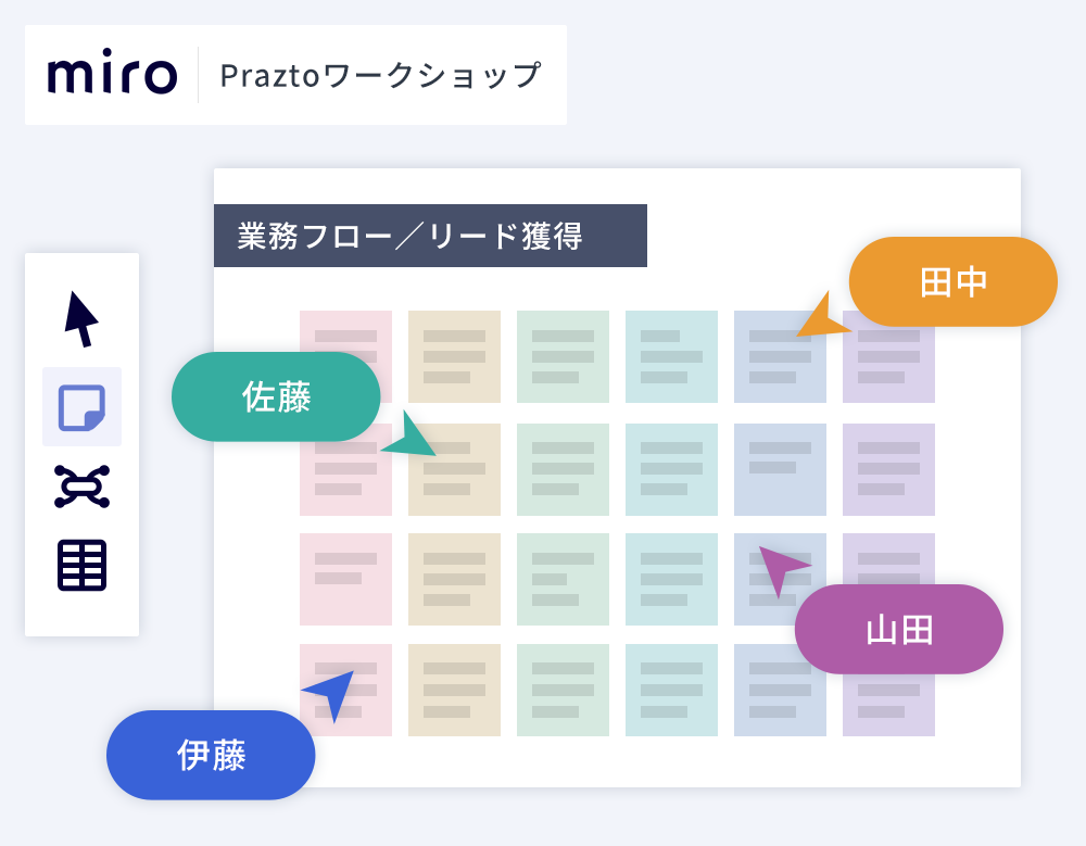 また、リゾルバは従来の研修でよく見られる資料説明がメインとなる一方通行型の教育に代わり、ビジュアルコラボレーションボード「Miro」を活用した双方向コミュニケーション&参加型の研修を行い、多くの実績を残しています。
