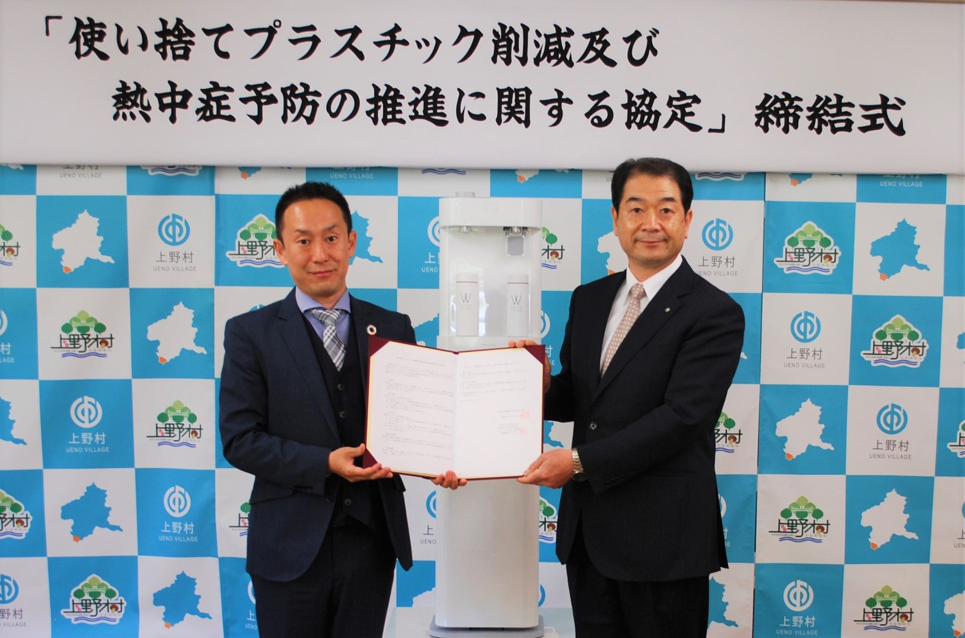 上野村と当社は、ペットボトル等の使い捨てプラスチックの削減及び熱中症予防等を推進するため、また2050年までに二酸化炭素排出量を実質ゼロにする「ゼロカーボンシティ」の実現に向け、マイボトル等に給水できる環境整備を推進します。当協定は、村内の公共施設にマイボトルへの給水が可能なウォータースタンドを設置し、ペットボトル等のワンウェイプラスチック製品の使用抑制について積極的に啓発し地球環境の維持と改善を図ることを目的に締結するものです。