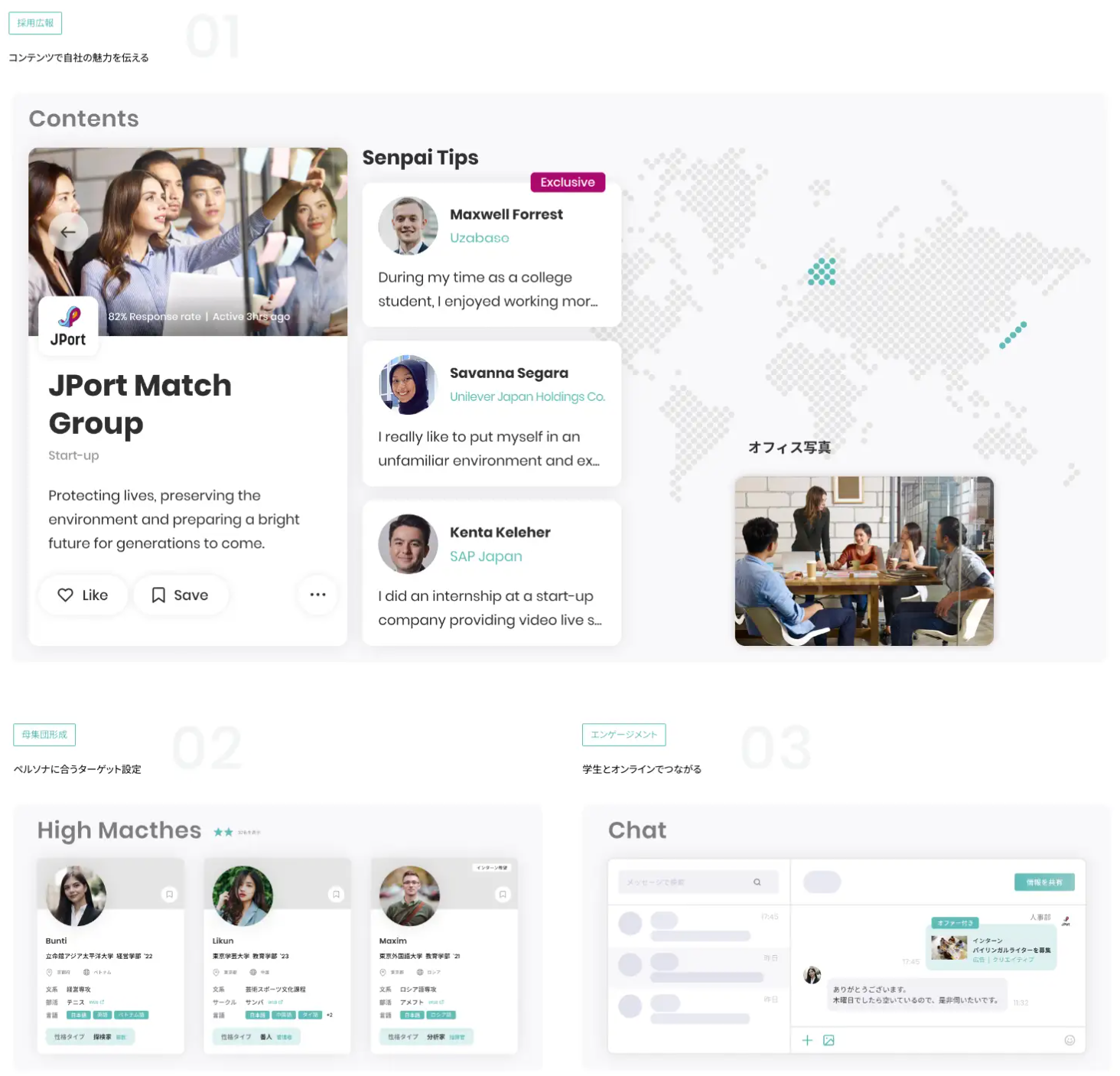 英日両方で採用広報~母集団形成を実現し、企業単位で登録ユーザーと直接コミュニケーションをオンラインですることができます。