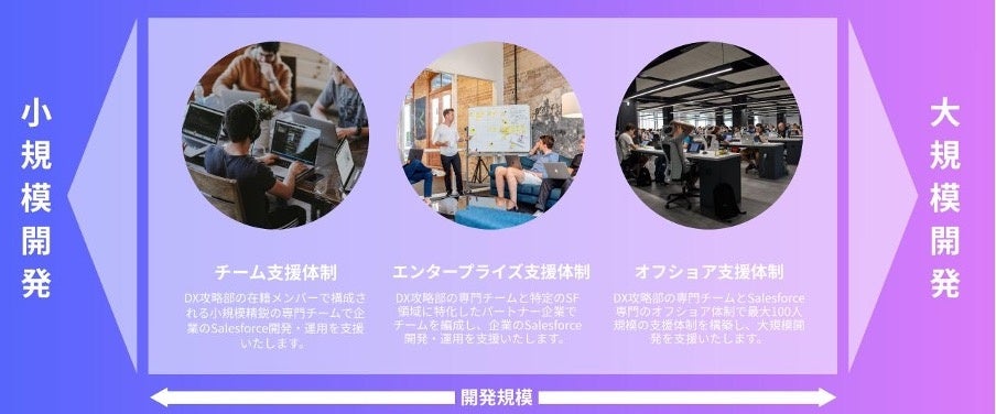 今回SORAMICHIは、Salesforceの導入支援・オフショアの開発体制を強化することで、中小企業からエンタープライズまで、業種業態にかかわらず幅広い対応が可能となります。当社には、高度IT人材が多数在籍しており、お客さまのニーズに合わせた柔軟な対応が可能なほか、経験・実績豊富なオフショア体制でのご支援も可能です。
