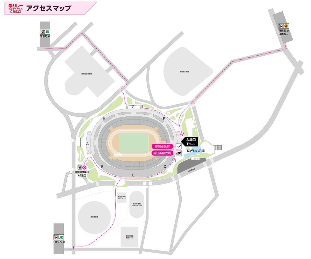 国立競技場は4つの入口があります。北側にあるのが「千駄ヶ谷門」、南側にあるのが「外苑門」、東側のバックスタンドは「青山門」、西側のメインスタンドは「中央門」です。リレフェスの入場ゲートは「外苑門」のEゲートです!!