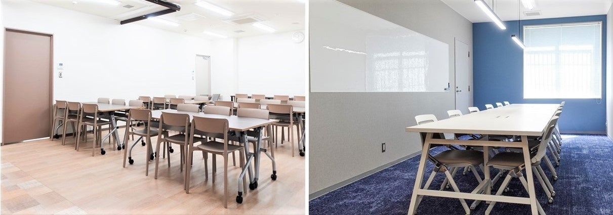 ■分断しない空間づくりはオフィスで働く誰もが利用できる (左)休憩室、(右)ミーティングスペース