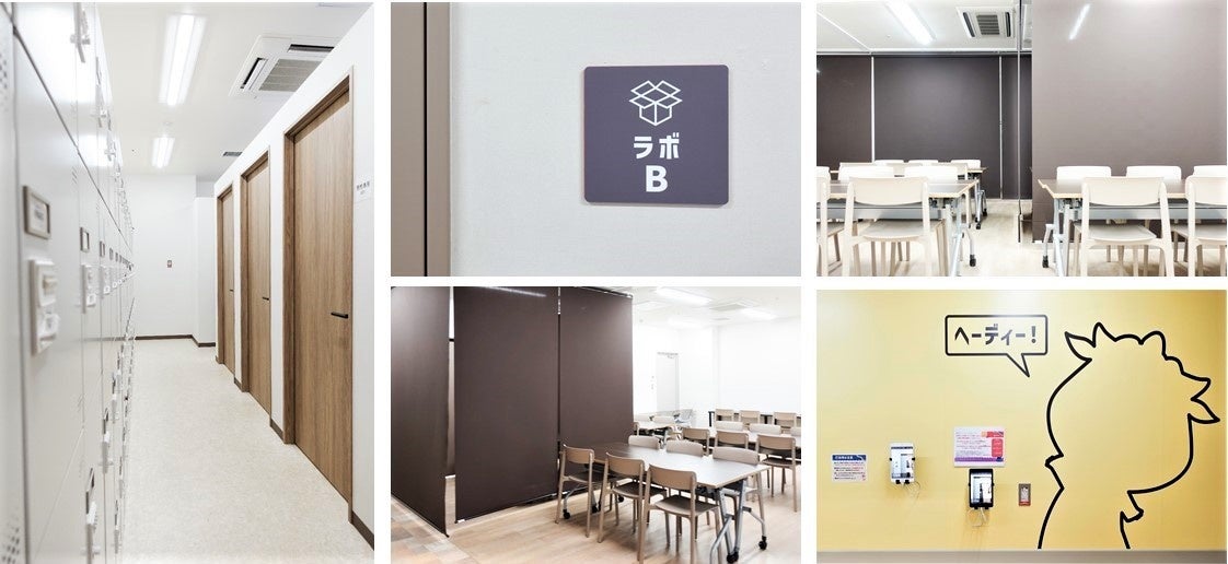 画像の説明(左)プライバシーを保ち、クリーンに刷新された更衣室はジェンダーレスに (中上)ピクトグラムを用いたサインで、誰にでも分かりやすく伝え空間にメリハリも生まれた (右上、中下)ブラインドの間仕切りを設置し、休憩室としてもミーティングスペースとしても使える設計 (右下)オフィスエントランスでは、テーマパーク内の挨拶「へーディー」と言ってカンドゥーの公式キャラクター「IGOR(イゴ―)」が迎えてくれる
