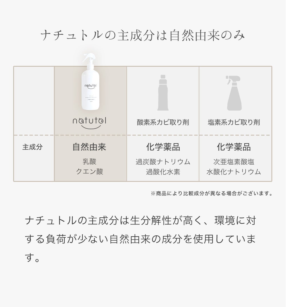 natutolのカビ取り成分は自然由来の発酵乳酸を使用し、素肌と同じ弱酸性。