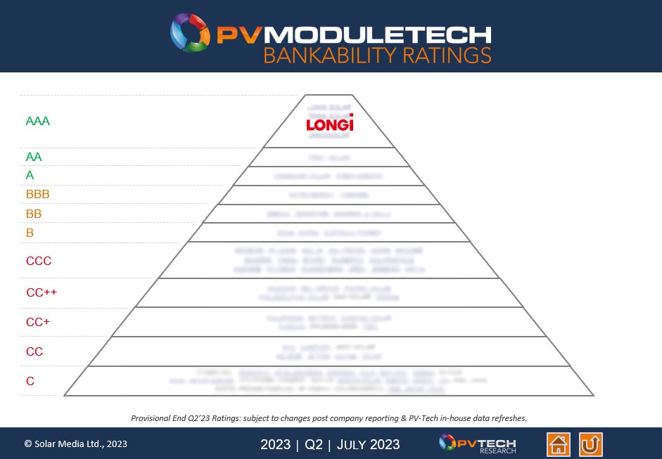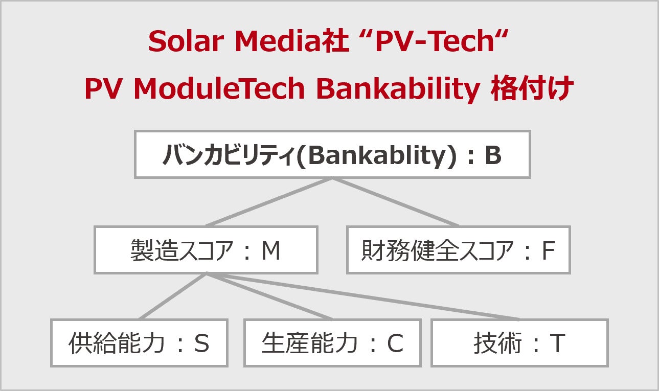 この格付けは、Solar Media社PV Tech分析チームが5年間の研究成果として開発し、2019年10⽉に誕生した太陽電池モジュール(太陽光発電パネル)メーカーに対する総合的なバンカビリティ(Bankability)判定手法です。バンカビリティは、製造スコアと財務健全スコアから成り立ち、そのうち製造スコアは供給能力・生産能力・技術の3つから成ります。そして、これらの評価は全て、実際の太陽光発電所プロジェクトの実績情報に基づいて意思決定を行おうとする投資家や利害関係者が、重要視していると考えられています。
