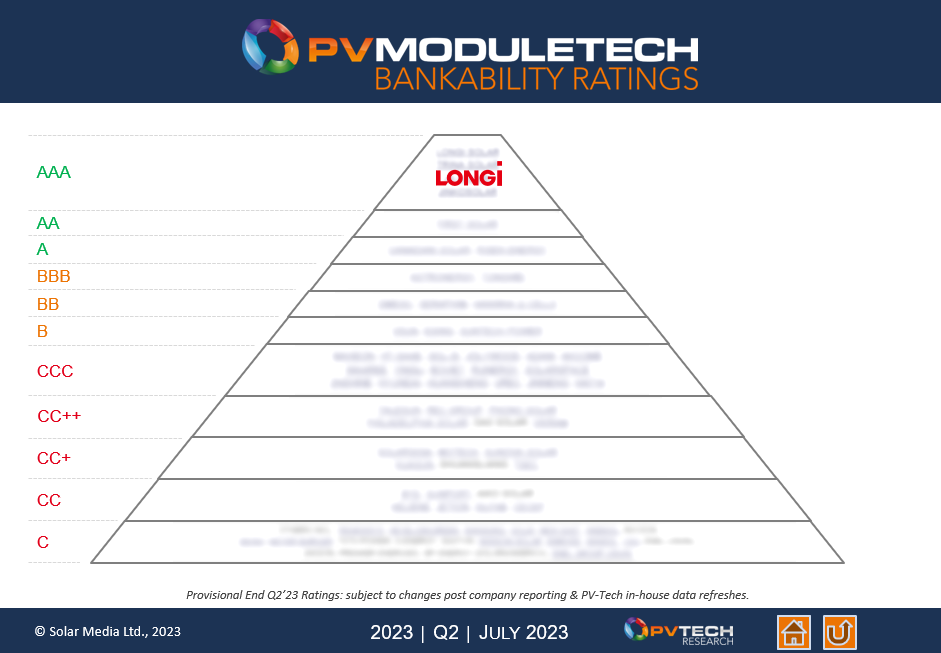 この格付けは、Solar Media社PV Tech分析チームが5年間の研究成果として開発し、2019年10⽉に誕生した太陽電池モジュール(太陽光発電パネル)メーカーに対する総合的なバンカビリティ(Bankability)判定手法です。バンカビリティは、製造スコアと財務健全スコアから成り立ち、そのうち製造スコアは供給能力・生産能力・技術の3つから成ります。そして、これらの評価は全て、実際の太陽光発電所プロジェクトの実績情報に基づいて意思決定を行おうとする投資家や利害関係者が、重要視していると考えられています。
