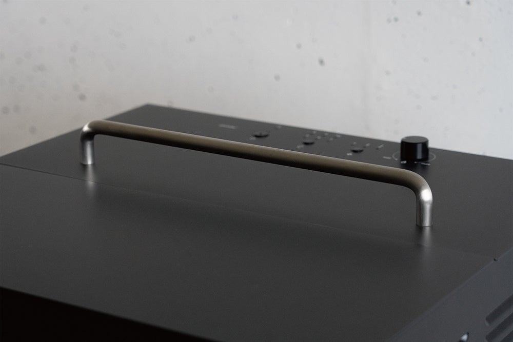 黒の本体に映えるステンレスが意匠のアクセントとなっています。また、人の手が触れるハンドル部を同素材で統一したことにより、視覚的に使い方を伝えるという機能的な面も兼ね備えています。