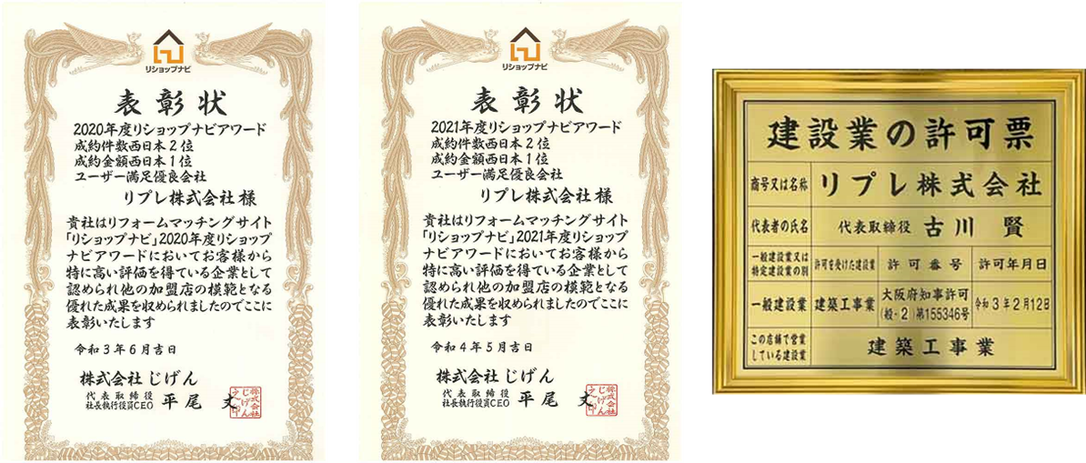 リプレ株式会社は2019年10月よりリショップナビに加盟し、浴室やキッチン、洗面台など水回りのリフォームを中心にご提供しています。集計を始めてからの初年度より「ユーザー満足優良会社」や「リショップナビ西日本成約金額」の1位を受賞。「リショップナビ西日本成約件数」では2位を受賞いたしました。