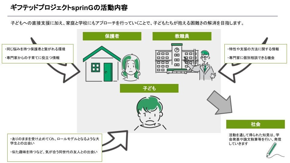 sprinGで居場所作りに取り組んできた経験をもとに、これまで目が向けられることが少なかった特異な才能のある子どもが抱える困難さや必要な支援についてお伝えし、学校現場での指導の方法などについて悩みを抱える先生方をサポートします。