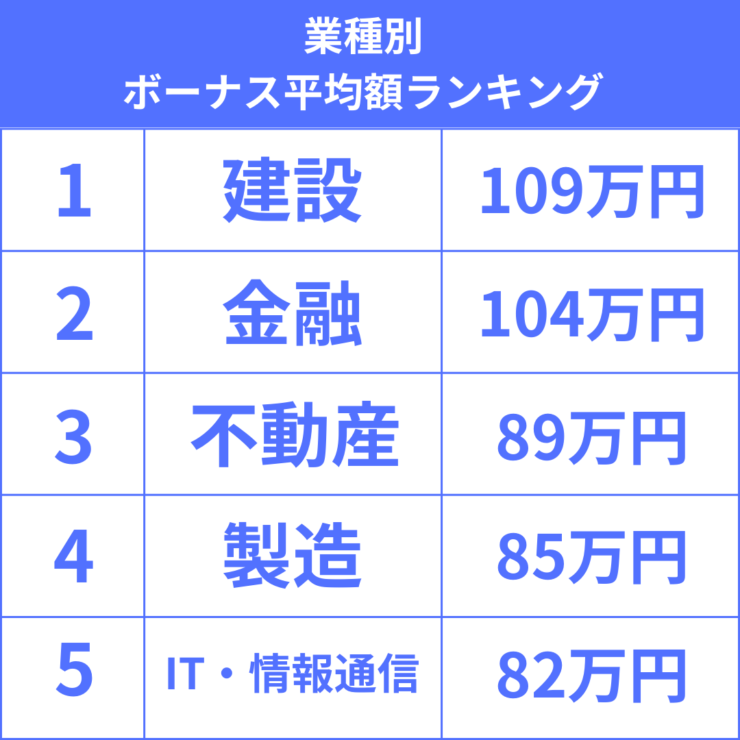 平均109万円で建設業が1位に輝きました。一級建築士など資格やスキルを保有していると、ボーナス金額を含めて年収が大幅に上がりやすく、これがボーナス平均額を高めた要因と言えるでしょう。