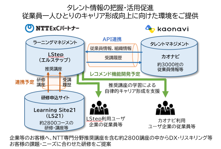 これら社会環境の変化を踏まえ、「専門性を重視した研修等」をeラーニングにて提供可能な、当社のクラウド型学習管理システム「LStep(エルステップ)」とタレントマネジメントシステム「カオナビ」をシステム連携し、ワンストップでご提供させていただくことで、人事部門における人事戦略策定、利便性向上や業務の効率化、従業員の自律的なキャリア形成支援など、企業等におけるデータドリブンな人的資本経営の推進に貢献してまいります。