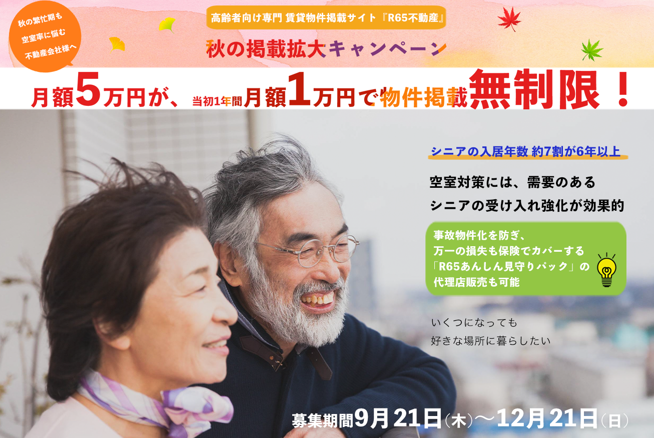 そこで弊社では、高齢者が入居可能な賃貸住宅の総数を増やし、高齢者の賃貸住宅への受け入れ促進を目指して、今年の春に実施した高齢者が入居可能な賃貸住宅を専門で扱う「R65不動産」に初年度月額1万円で無制限に物件掲載いただける”掲載拡大キャンペーン” を再開催いたします。