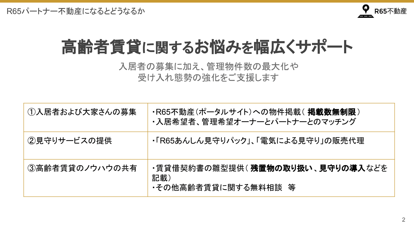 「R65パートナー不動産」とは、65歳からのお部屋探しを専門で支援するR65不動産の公式パートナー制度です。2023年9月現在、約40社の不動産会社様に「R65パートナー不動産」になっていただいており、R65不動産では高齢者と地域に優しい不動産会社を目指して、入居者や大家さんの募集、高齢者の見守りサービスの提供、ノウハウの提供などを支援いたします。