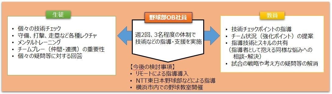 一方、NTT東日本では企業スポーツ活動をとおして社会への貢献をめざしており<*3>、その活動の一環として、「青少年の健全な育成」・「スポーツ振興」を目的に、例年、NTT東日本シンボルチームの野球部やバドミントン部等がチームごとにスポーツ教室を開催しており、その経験と理念と上記社会情勢を踏まえ、今回の野球部OB社員による中学部活動支援の実施に至りました。
