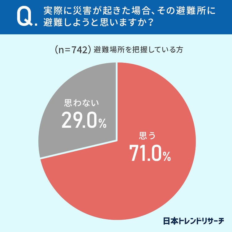 29%の方が実際に災害が起きた場合、その避難所に避難しようと「思わない」と回答しています。