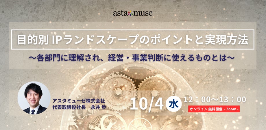 アスタミューゼ株式会社(本社:東京都千代田区、代表取締役社長 永井歩)は、2023年10月4日(水)12:00~13:00に、事業会社の知財担当者、R&D部門の方々を対象とした無料ウェビナー「目的別IPランドスケープのポイントと実現方法 ~各部門に理解され、経営・事業判断に使えるものとは~」を開催いたします。過去複数回実施しておりますが、大変好評のため再度の開催となります。