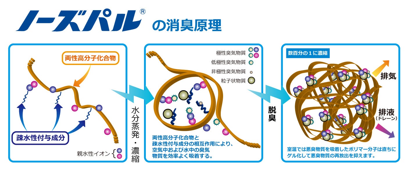消臭成分の主剤であるポリマーの分子内に悪臭成分を吸着・捕捉することでニオイ成分を確実にとらえて、臭わない環境を提供します。さらには疎水性低分子化合物を組み合わせ、空中・水中の臭気成分をより効率良く吸着させることに成功しました。