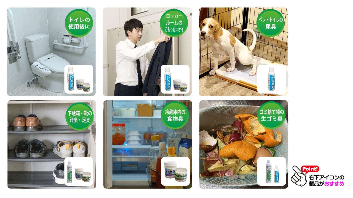 更衣室・宴会場・車の中・オフィス・トイレ・シューズボックス・汗や体臭の強い場所・ペットトイレ・ゴミ箱(生ゴミ)・喫煙室 他