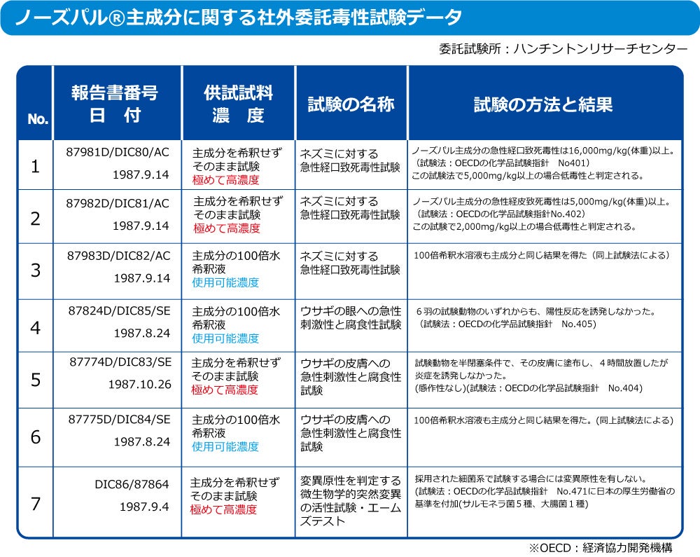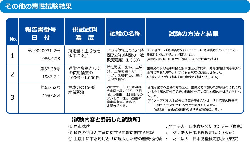「ノーズパルシリーズ」は、消臭剤・粉塵沈降剤として安全性関連法規の基準に合致し、社外委託毒性試験においても安全性か確認されています。