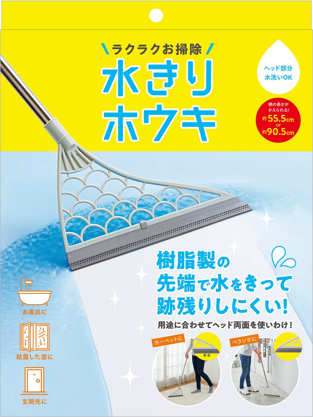 水を掃いて濡れた場所をキレイに!樹脂製の先端で水をきって跡残りしにくい「水キリホウキ」。