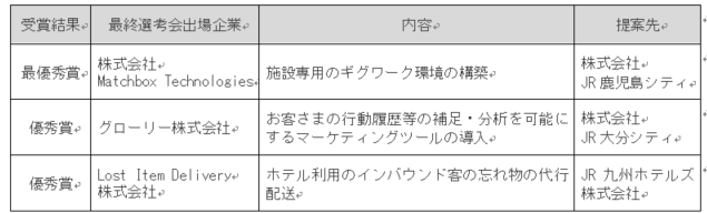 本コンテストでは、JR九州グループ会社が抱えるタスクを解決し、企業の成長を加速させることを目的として、「業務効率化」、「コスト削減」、「IoT/データ活用」、「施設/店舗の利用拡大」、「人材確保」に沿った提案を募集しました。