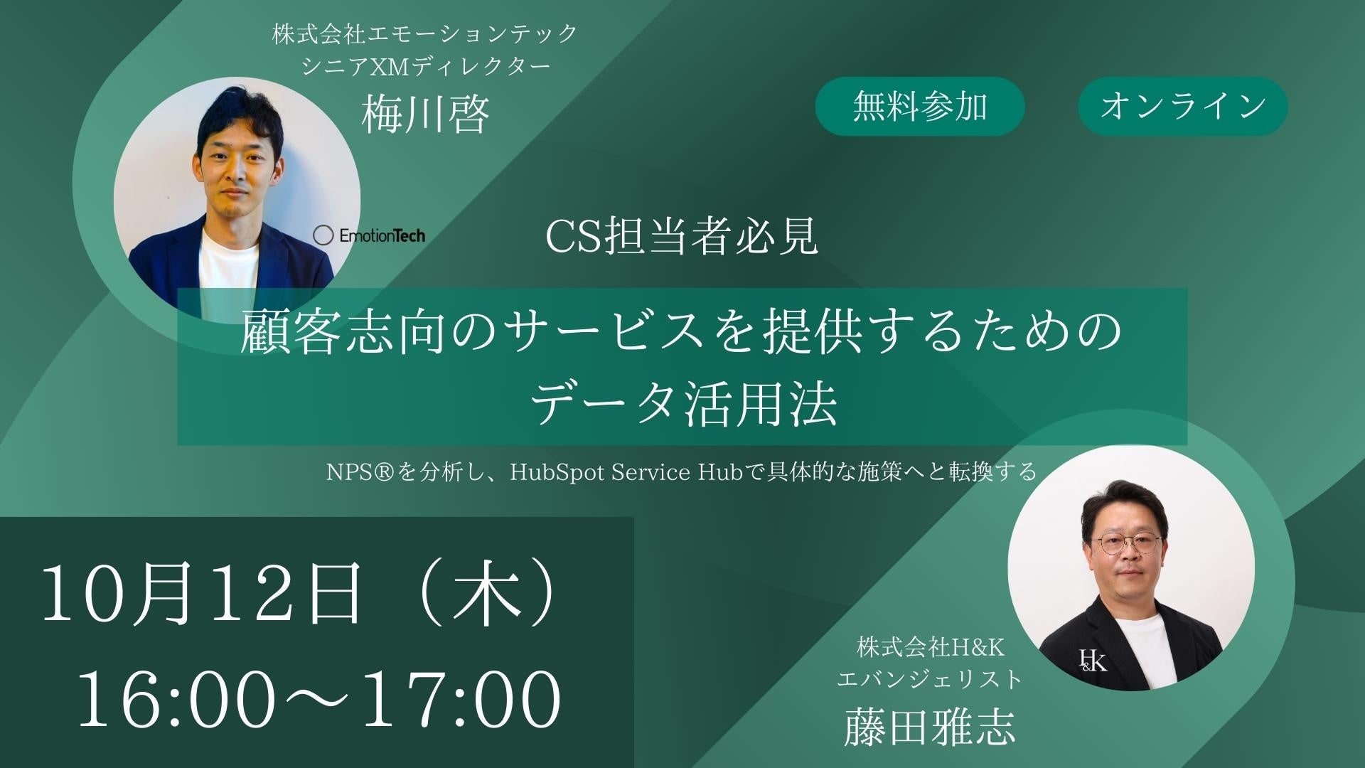株式会社H&Kは、2023年10月12日(木)16:00〜17:00の日程でZOOMにて「【CS担当者必見】顧客志向のサービスを提供するためのデータ活用法 〜NPS®を分析し、HubSpot Service Hubで具体的な施策へと転換する〜」と題してセミナーを開催いたします。
