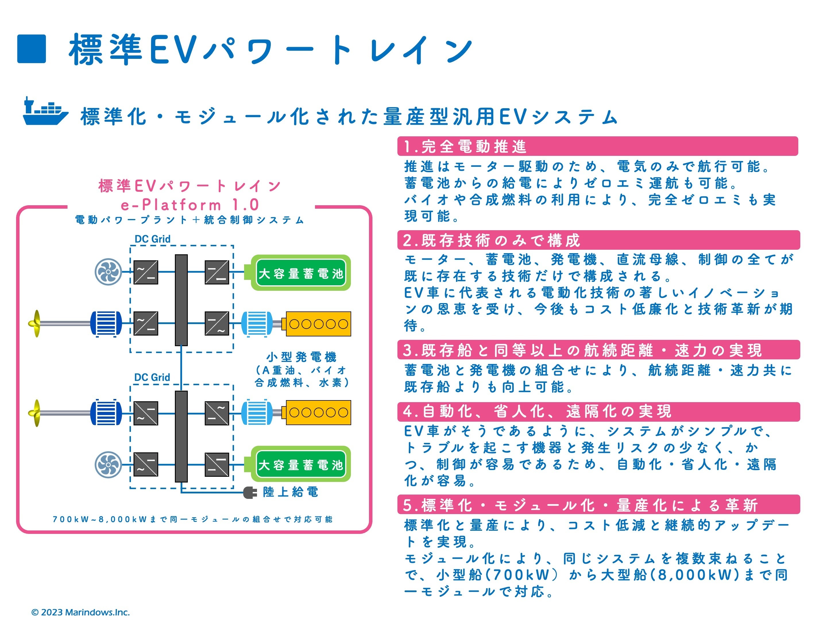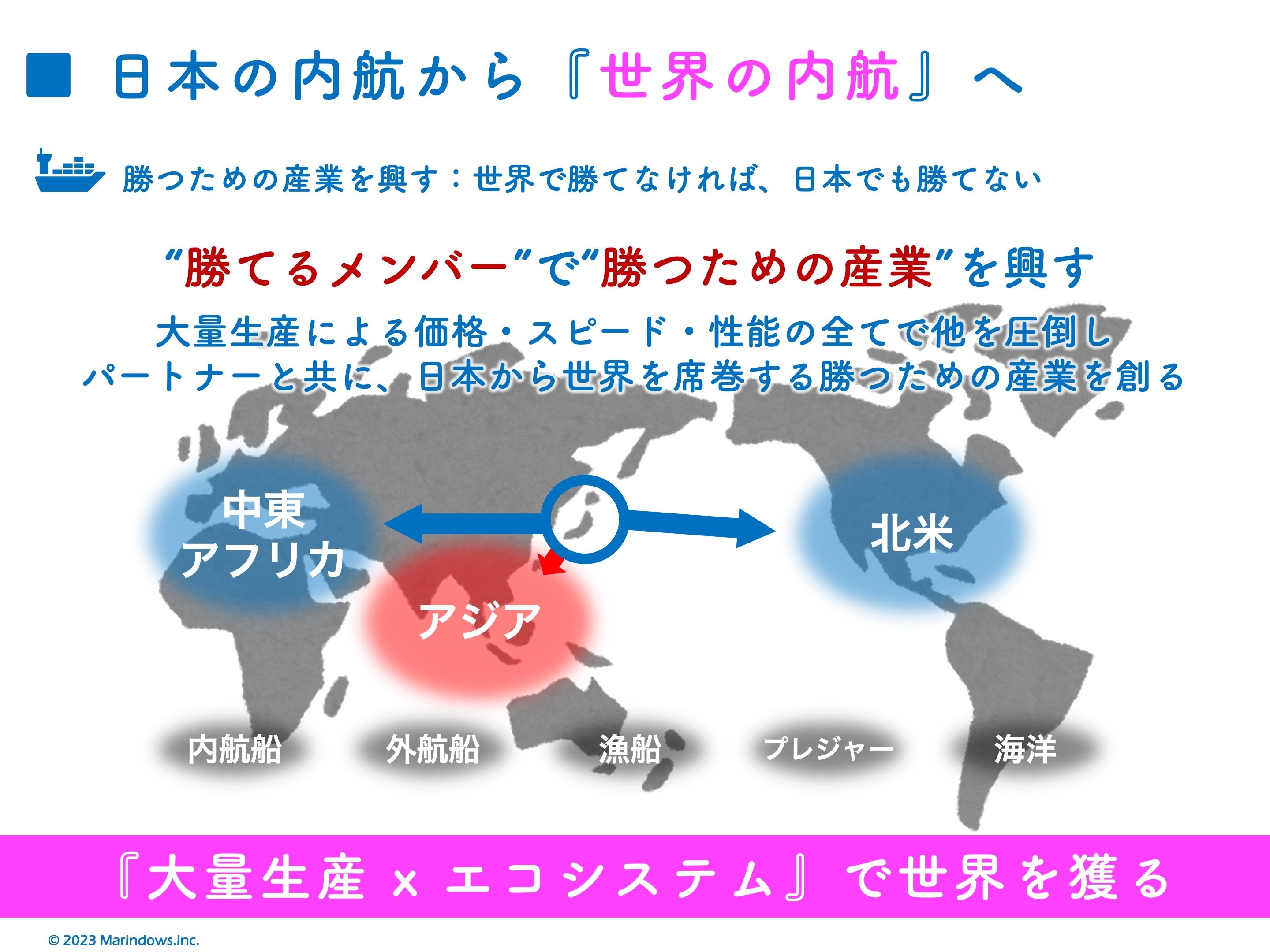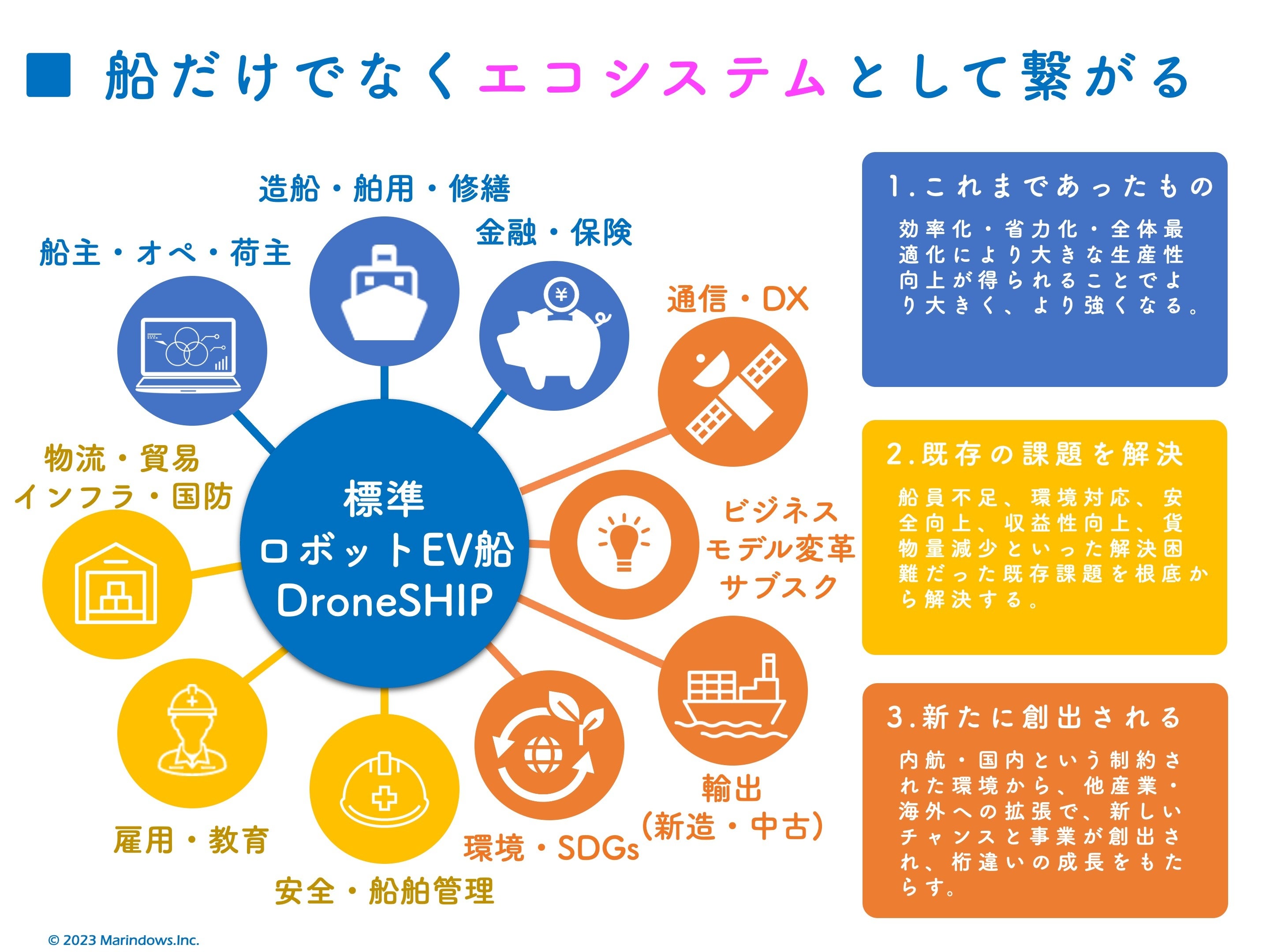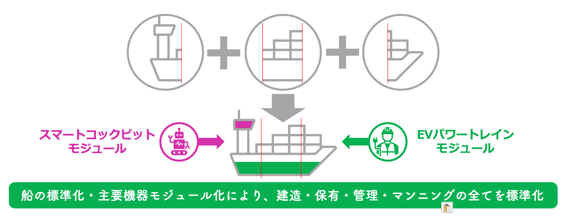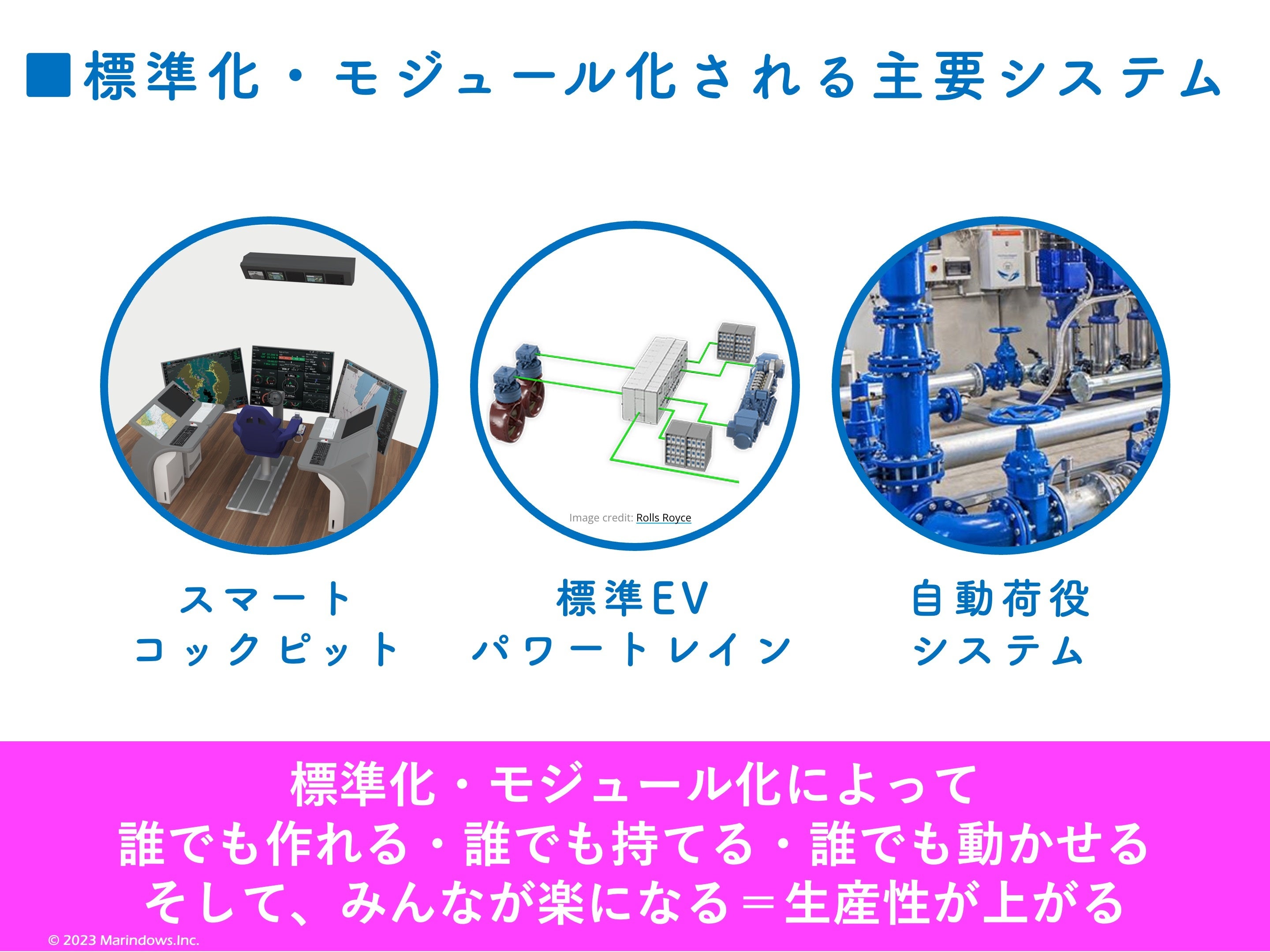標準化という他産業では一般的なビジネスモデルにより、日本が得意とする最先端・最高品質の製品を最大スケールと価格競争力で提供できるようになる。 電動パワートレイン・通信・ソフトウェア・IoT・AIといった先端技術の『標準化』『モジュール化』提供により、誰もが先端技術を使えるようになるので、船の現場の生産性が向上し、船員の給料や船主の経済性が高くなる。 |